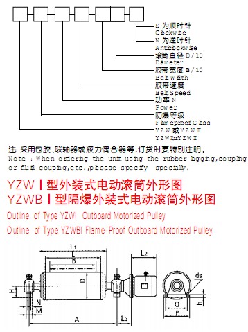 該產品是供各種固定式帶式輸送機、斗式提升機、卷揚機等配套的新型驅動裝置。其內部采用行星擺線減速機構,使電機外露與滾筒直聯,具有承載能力大、過載能力強、傳動平穩(wěn)、噪音低、壽命長,使用維修方便,操作安全可靠等優(yōu)點??蓾M足各種逆止、包膠等要求。隔爆外裝式電動滾筒其隔爆標志位dl、dllAT4。dl適合于有甲烷或煤塵礦井中,dllAT4適合于有I、IIA級T2~T4組爆炸危險性混合物存在的場所,dllBT4適用于有I、IIA、IIB級T2~T4組爆炸危險性混合物存在的場所。