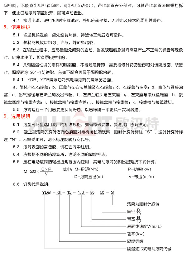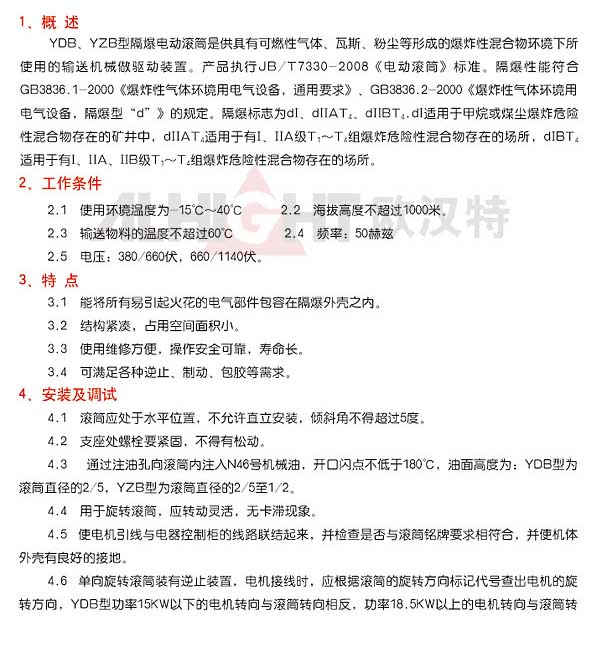 該產(chǎn)品是供具有可燃性氣體、瓦斯、粉塵等形成的爆炸性混合物環(huán)境下帶式輸送機所使用的驅(qū)動裝置。產(chǎn)品嚴(yán)格執(zhí)行JB/T7330-08《電動滾筒》標(biāo)準(zhǔn)。隔爆性能符合GB3836.1-2000《爆炸性氣體環(huán)境用電氣設(shè)備、通用要求》、GB3836.2-2000《爆炸氣體環(huán)境用電氣設(shè)備,隔爆型"d"》的規(guī)定。隔爆標(biāo)志為dl、dllAT4、DllBT4。dl適合于所有甲烷或煤塵爆炸危險性混合物存在的礦井中。